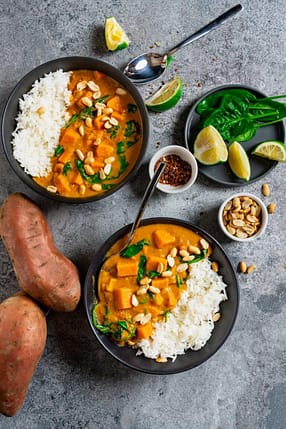 Pflanzliche Esser, wir haben Sie nicht vergessen! Unser veganes Süßkartoffel-Erdnuss-Curry ist eine schmackhafte und proteinreiche Option, die sich perfekt für die Zubereitung von Mahlzeiten eignet. Die Kombination aus Süßkartoffeln, Erdnussbutter und aromatischen Gewürzen ergibt ein Mittagessen, das ebenso nahrhaft wie köstlich ist.